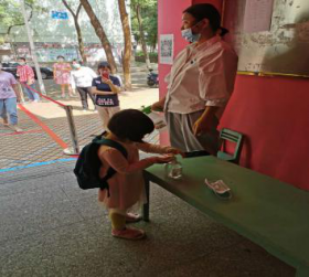 首先是入园环节,分为教职工入园和幼儿入园两个部分。教师入园前直接扫描二维码打卡,出示二维码通行证,接着用免洗洗手液消毒手部,值班老师对其进行体温测量作好记录,用消毒喷雾消毒全身和脚底,教师到各自班级换上工作服后用七步洗手法清洁后上岗;幼儿入园在家长带领下分时段到指定区域,间隔一米以上有序排队,做好个人防护准备入园。家长扫描二维码出示健康通行证,幼儿到值班老师处进行测温,检查无异后家长方可离开。幼儿到指定区域进行手部清洁、全身消毒和脚底消毒,并在本年级值班老师引导下进入班级,交由至班级老师指导孩子七步洗手法洗手,洗完手回到教室参与阅读、玩玩具或聆听音乐等活动。