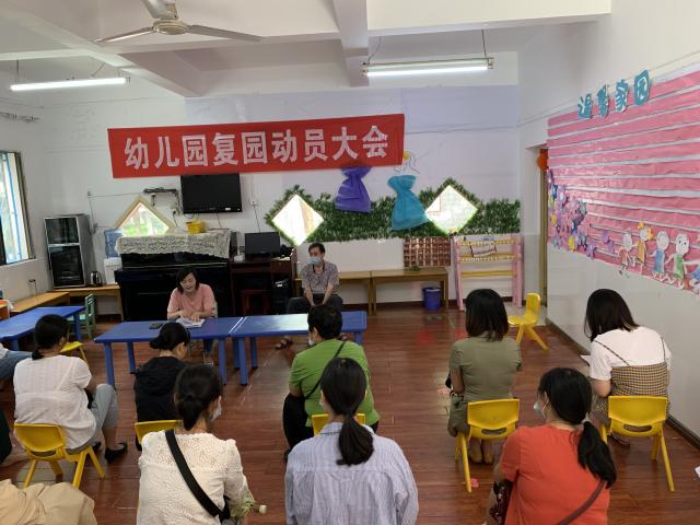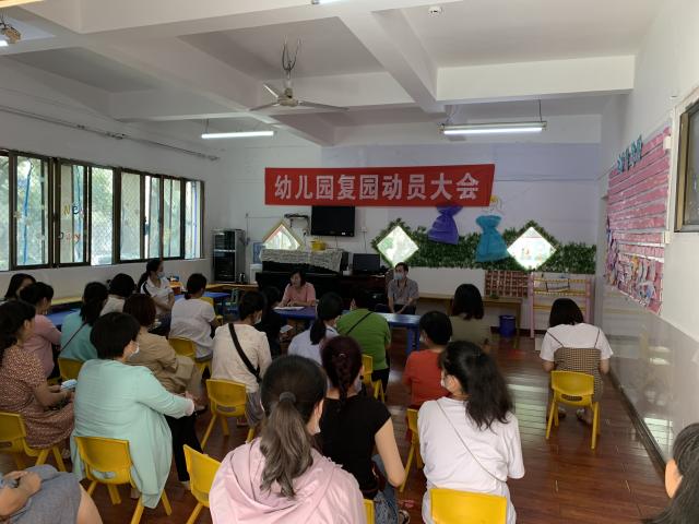 根据省教育厅《关于做好 2020 年春季学期全省中小学校(幼儿园)、中职学校学生返校(园)学习有关工作的通知》以及市、区有关疫情防控部署文件的指导精神,为切实做好我园新型冠状病毒的疫情防控工作,确保师幼的生命安全与身体健康,推进幼儿园有序安全、顺利复学工作,5月31日上午我校幼儿园组织全体教职员工在小二班教室召开了复学动员大会,陈园长主持会议,工会副主席吴太福到会指导。