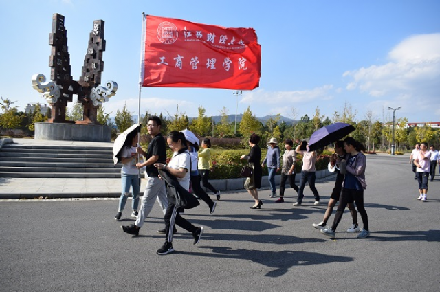 跟随着学院的旗帜,教职工围绕麦庐园南北区,沿着既定路线开展教职工健步走项目。健步走项目从北区篮球场入口处开始,各位选手在入口处领取路线图,步行至到第一教学楼、第二教学楼之间的明德广场补给站加盖印章并围绕校区返回至北区篮球场进行趣味运动比赛。