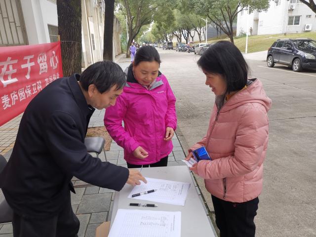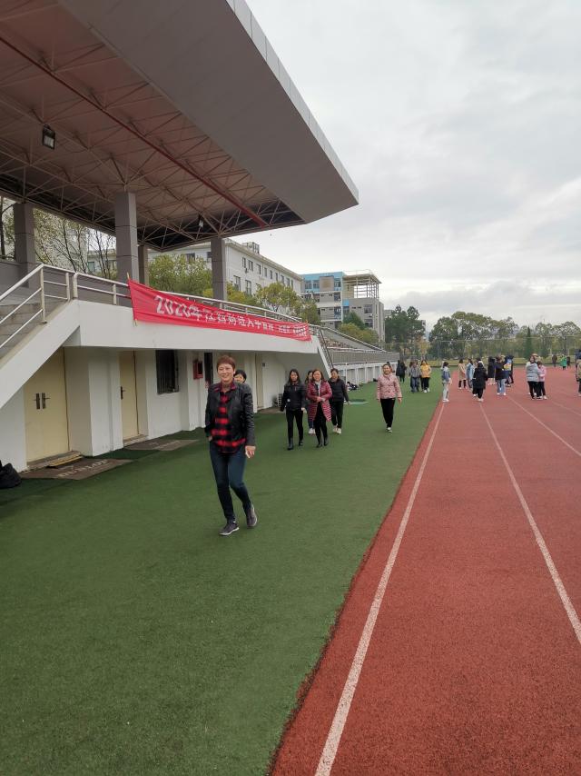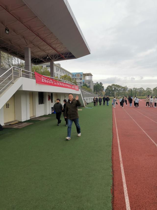 9点开始,广大教职工就集聚在麦庐园体育场门口,准备出发,为了安全起见,工会要求教职工在运动场内步行一圈后,沿麦庐校园主干道的人行道绕行一圈,中途设置两个打卡点,再回到出发点。