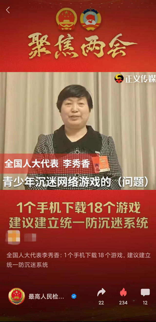 近日,最高人民检察院视频号“聚焦两会”、正义网报道了全国人大代表、我校贸易与环境研究中心主任李秀香教授针对加强互联网管理,防止青少年沉迷网络游戏提出的相关建议。