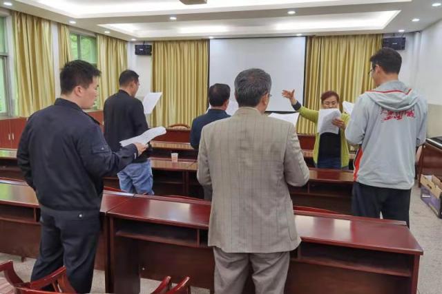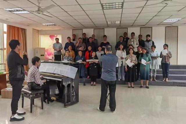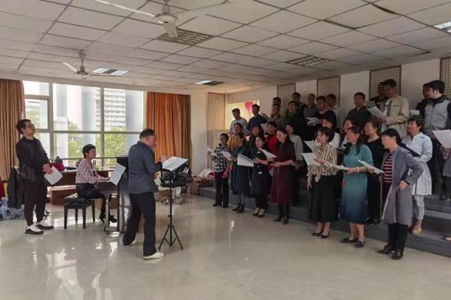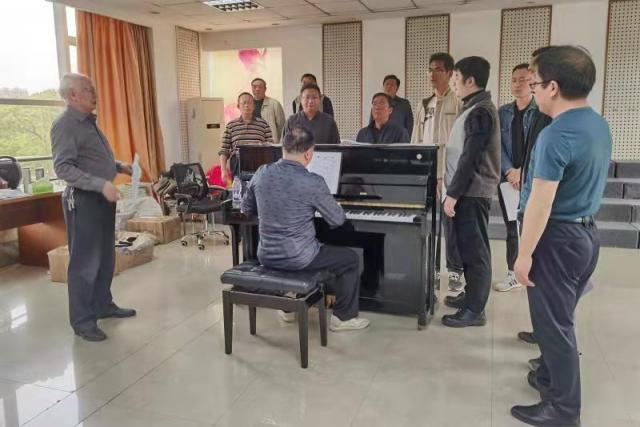 合唱队伍由教授、博导、离退休老同志、单位负责人、党团干部、专业老师等人员组成,其中最大年纪的万铁羽老师已经70多岁,队员们克服种种困难,利用业余时间参加排练,在4月21日下午的合练中,全体合唱队员精神饱满,歌声嘹亮,指挥韩玉澎老师在两个多小时的排练结束后汗水浸湿了整个后背。训练结束后,不少队员还留下来与专业指导老师交流演唱发声方法和旋律处理方式,队员们纷纷表示,在专业老师的带领下,掌握了更多的演唱技巧,进步明显,希望能以最好的状态参加本次献礼展演。
