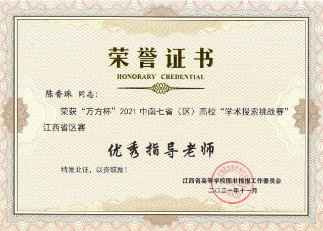 我校图书馆也因出色的组织工作同时获评江西省赛区“优秀组织单位奖”,图书馆张春晖、陈香珠两位老师荣获“优秀指导老师奖”。