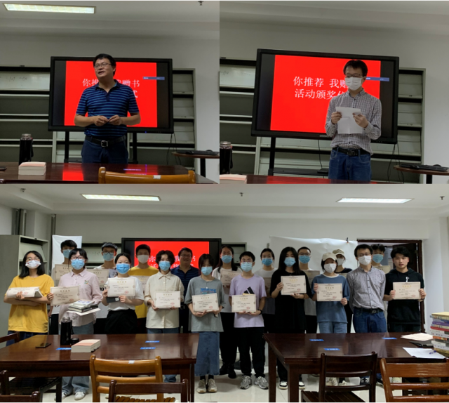 5月27日,图书馆和秋水读书社联合举办的“你推荐,我赠书”活动颁奖大会在麦庐园图书馆五楼举行,人文学院教授尹忠海、图书馆副馆长吴晓波和近50余位同学参加仪式,仪式由秋水读书社梅文同学主持。