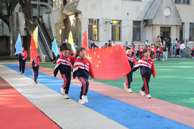 迎着灿烂的朝阳,伴着铿锵有力的《运动员进行曲》,在国旗队、彩旗队的带领下,小小运动员们个个精神饱满,迈着矫健的步伐,排着整齐的队伍步入会场。在主持人充满激情的解说中,小运动员们高喊着班级口号,向大家展示着积极、健康、向上的班级风貌。庄严的国歌响起,他们挺起胸脯,面向国旗,心中充满自豪感。
