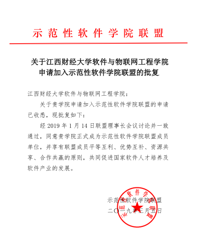 我校软件与物联网工程学院于2019年1月14日由示范性软件学院联盟理事长会议讨论并一致通过,同意其正式成为示范性软件学院联盟成员单位,并享有联盟成员平等互利、优势互补、资源共享、合作共赢的原则,共同促进国家软件人才培养及软件产业的发展。