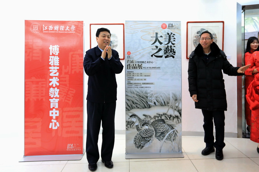 1月3日,江西财经大学博雅艺术教育中心与“大美之艺——首届江财博雅艺术教育中心作品展(暨艺术学院教师美术作品展)”的揭牌与开幕仪式隆重举行。校党委书记王乔、校长卢福财分别为展览揭幕和博雅艺术教育中心揭牌。校党委副书记蒋金法,校党委常委、纪委书记杨建林,校党委常委、副校长王小平,校党委常委、副校长阙善栋,校党委常委、副校长欧阳康,校党委常委、副校长袁雄,校党委常委、组织部长许基南,校党委常委、宣传部长王金海出席开幕式。仪式由副校长欧阳康主持。