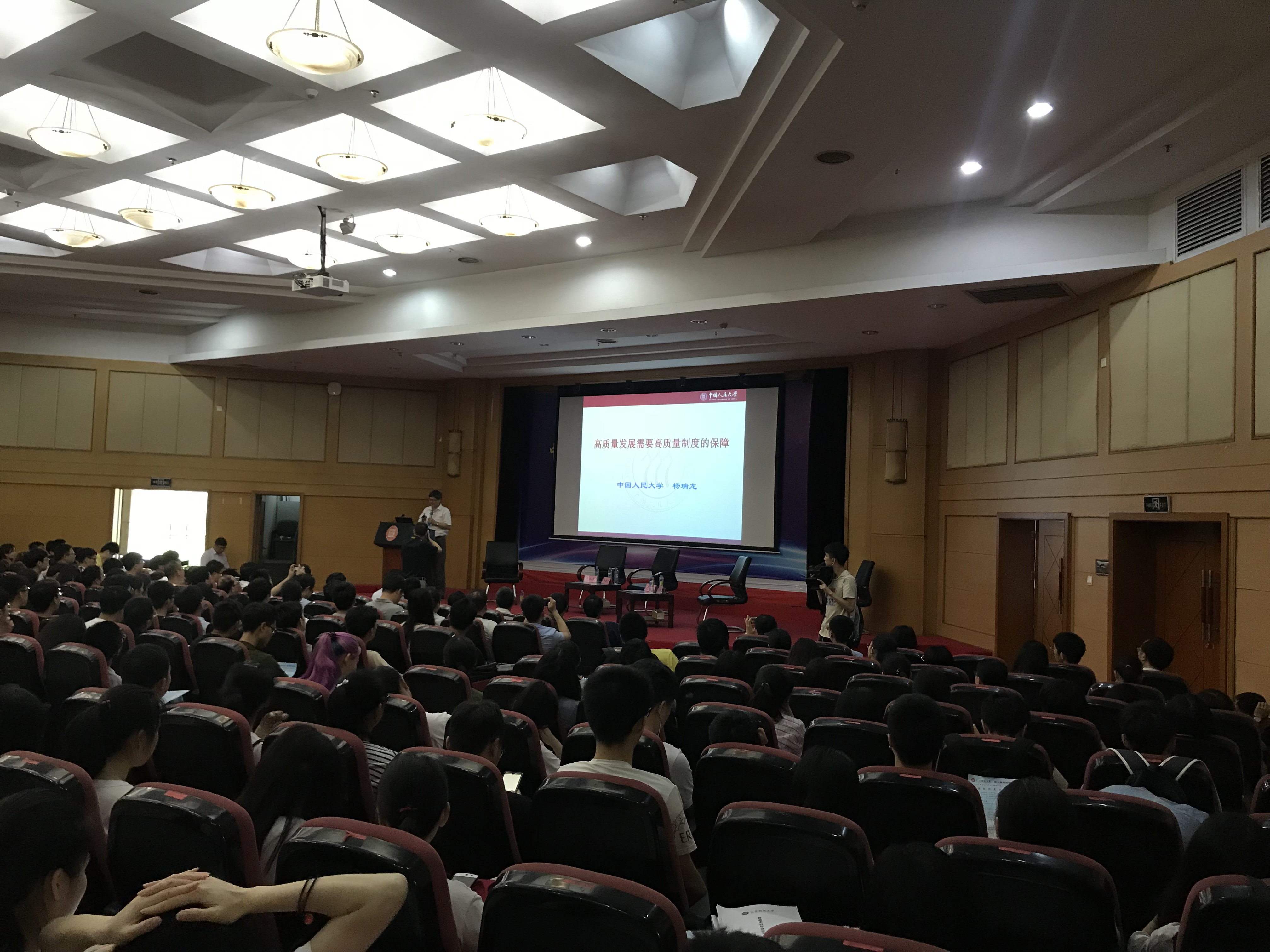 杨瑞龙教授从另外一个角度,为在座师生分析了高质量制度对于高质量发展的重要性。杨教授首先论述了高速度发展向高质量发展阶段转换的客观必然性,指出理解与适应经济新常态是时代之需;经济新常态条件下,未来八年我国经济政策的顶层设计是一个总要求、一条主线、三个攻坚战。他也提出,制度创新是推动高速度向高质量发展阶段转换的关键。在创新驱动发展、供给侧结构性改革两大抓手下,高质量发展的核心是实现新旧增长动能转换。以英国工业革命前诞生的专利制度为例,杨教授说,制度创新为技术创新提供了动力机制。建立创新型国家的关键是进一步深化改革,培育新增长动能及推进供给侧结构性改革的关键也同样是改革,重塑改革的动力机制是提升制度质量的关键。