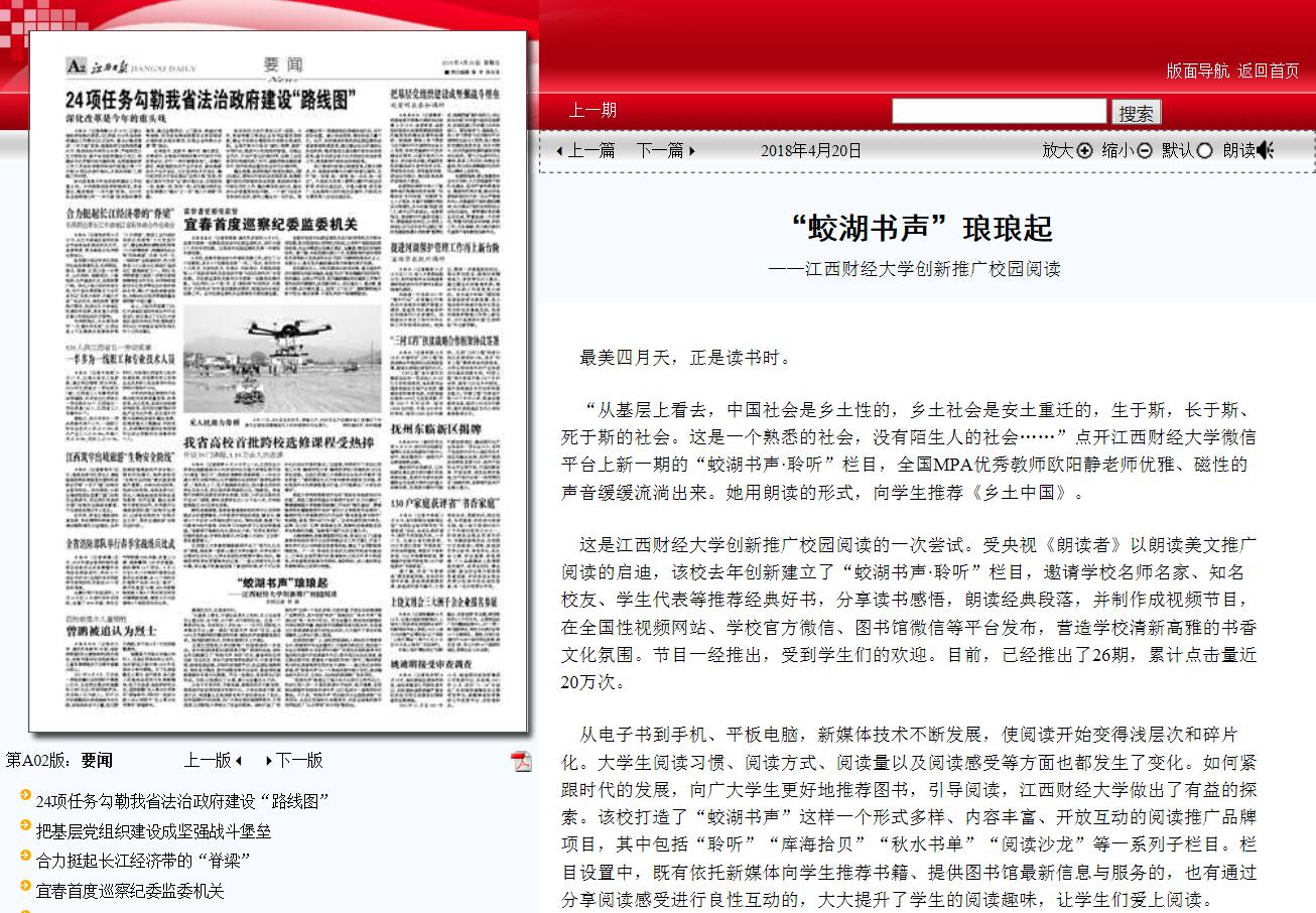 4月20日,《江西日报》A02要闻版以《“蛟湖书声”琅琅起——江西财经大学创新推广校园阅读》为题对我校“蛟湖书声”阅读推广工作进行报道。全文如下: