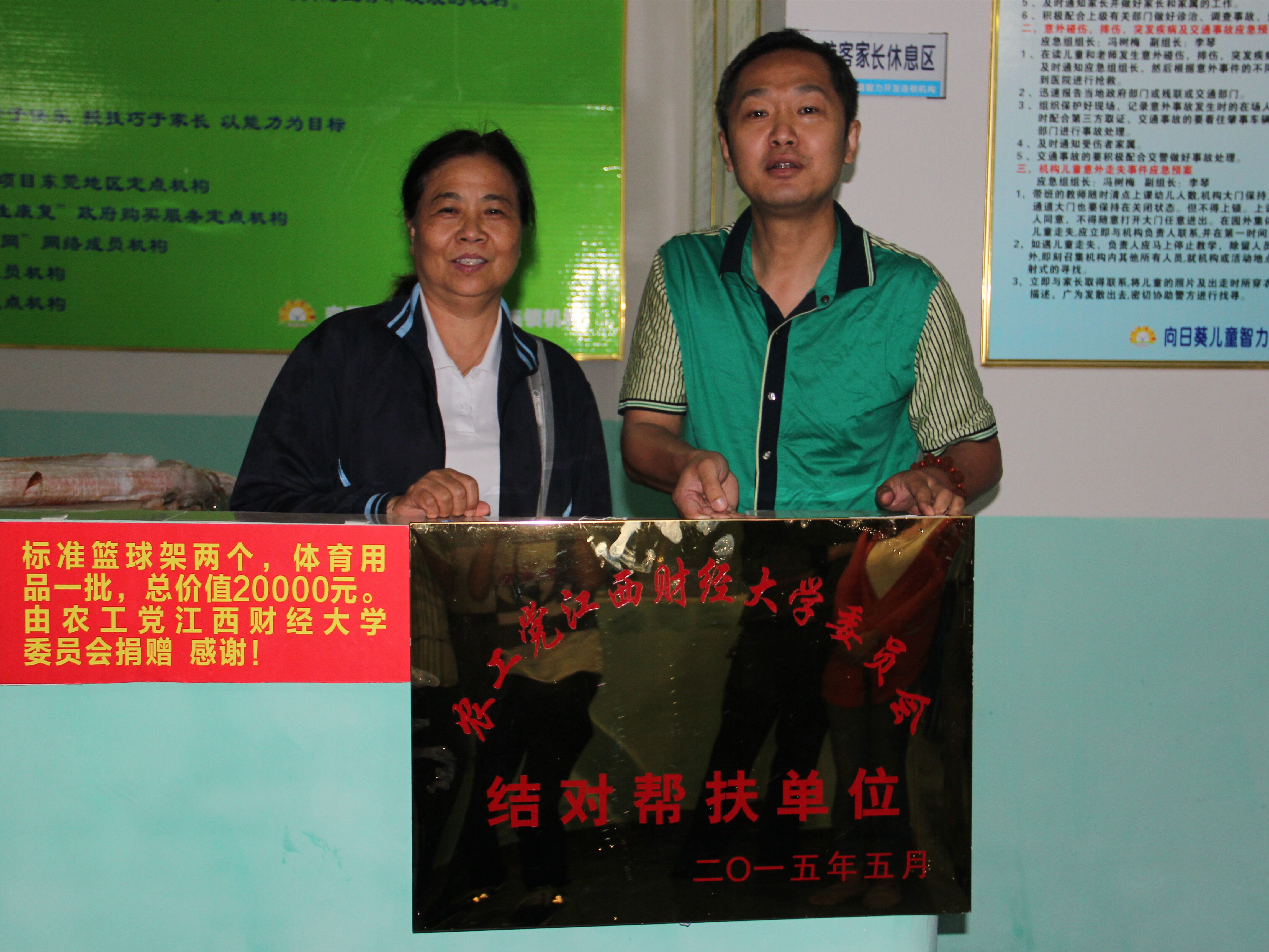15日上午,在体育学院党总支书记邹国辉和我校农工党主委崔开玲教授的带领下,活动一行人带着一颗公益心,携着一批爱心物资来到了向日葵儿童康复中心学校。在康复中心学校负责人的陪同下,一行人参观了校舍,并来到智障儿童的上课教室,同他们一起开心游戏。纵然大雨滂沱,挡不住满室温情。随后,举行了简单的“结对帮扶揭牌仪式”,体育学院与校农工党向康复中心学校捐赠了室外标准篮球架和一批体育用品等物资,总价值三万余元。修水县的相关领导、康复中心分校的负责人向体育学院及校农工党关心帮助残疾人、创造和谐友爱环境的善举表示了真挚感谢。