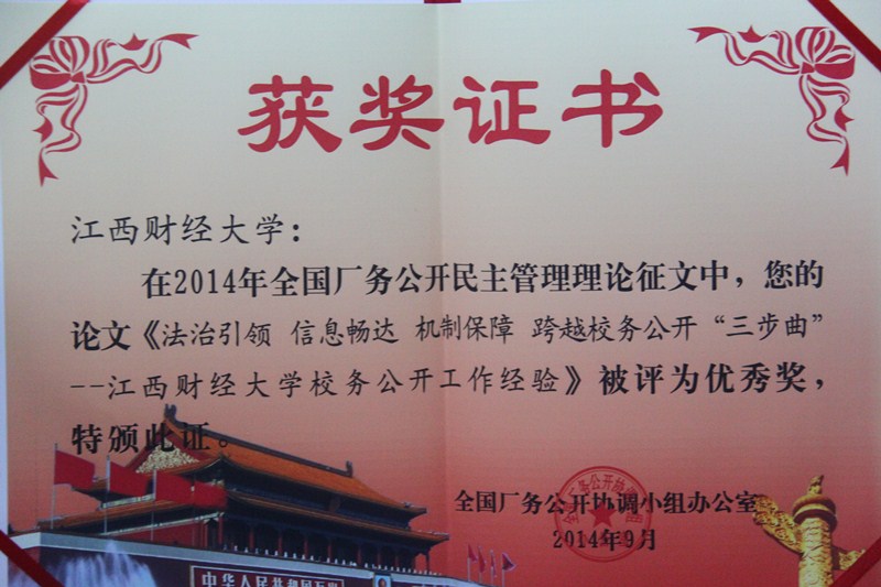最近,全国厂务公开协调小组办公室给我校发文,并颁发荣誉证书:我校工会主席刘金凤撰写的《法治引领 信息畅达 机制保障 跨越校务公开“三步曲”——江西财经大学校务公开工作经验》一文,在2014年全国厂务公开民主管理理论征文中,荣获全国优秀奖,这是全省高校唯一获奖单位。我校2013获全国厂务公开民主管理先进单位。该文是我校校务公开民主管理的经验之谈,在全省高校反映很大。此举又为我校赢得了荣誉。