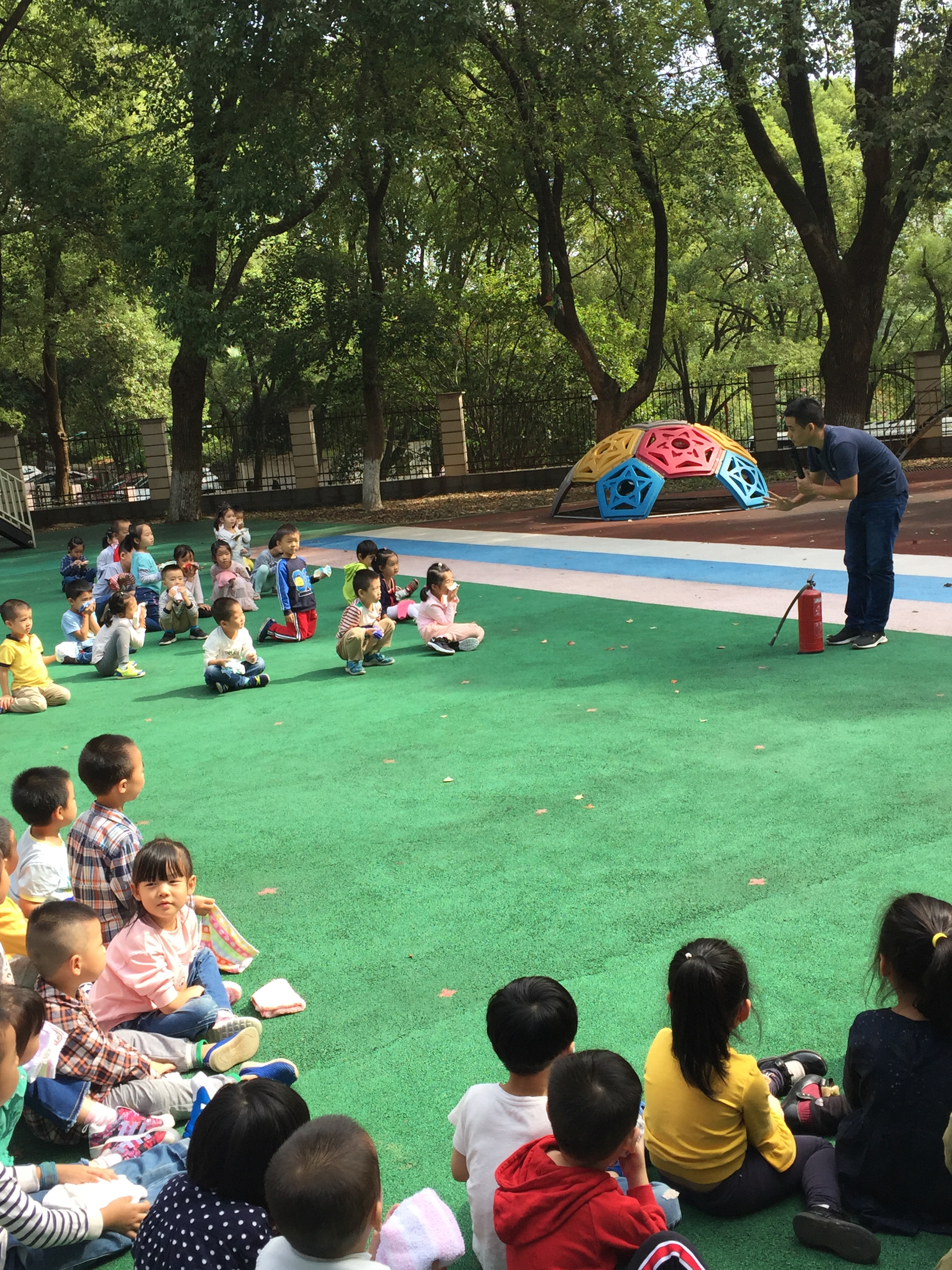 幼儿园于9月28日上午9:30,对全园师生进行了安全疏通消防演习活动。孩子们忽然听到紧急的警报声,各班教师迅速按紧急预案的疏散线路,带领幼儿拿起湿毛巾,捂住口鼻,躬着身子,分两道楼梯迅速且有序离开教室,很快孩子们集中到操场安全地带。演习结束后,刘教官为孩子们讲述为什么在演习用毛巾,以及使用的正确方法;还进行演示用灭火器灭火的过程;如何开启灭火器?地震的发生如何逃生?让孩子们知道如何懂得保护自我,如何逃生。随后孩子们还和教官互动,向教官请教了一些不懂的问题,教官很有耐心的一一向孩子们解答。通过这次演习的活动,不仅让师生们懂得发生火灾后如何进行自救、如何逃走、如何拨打119电话报警,更懂得了面对突然发生的重大事故要沉着冷静,紧急撤离。