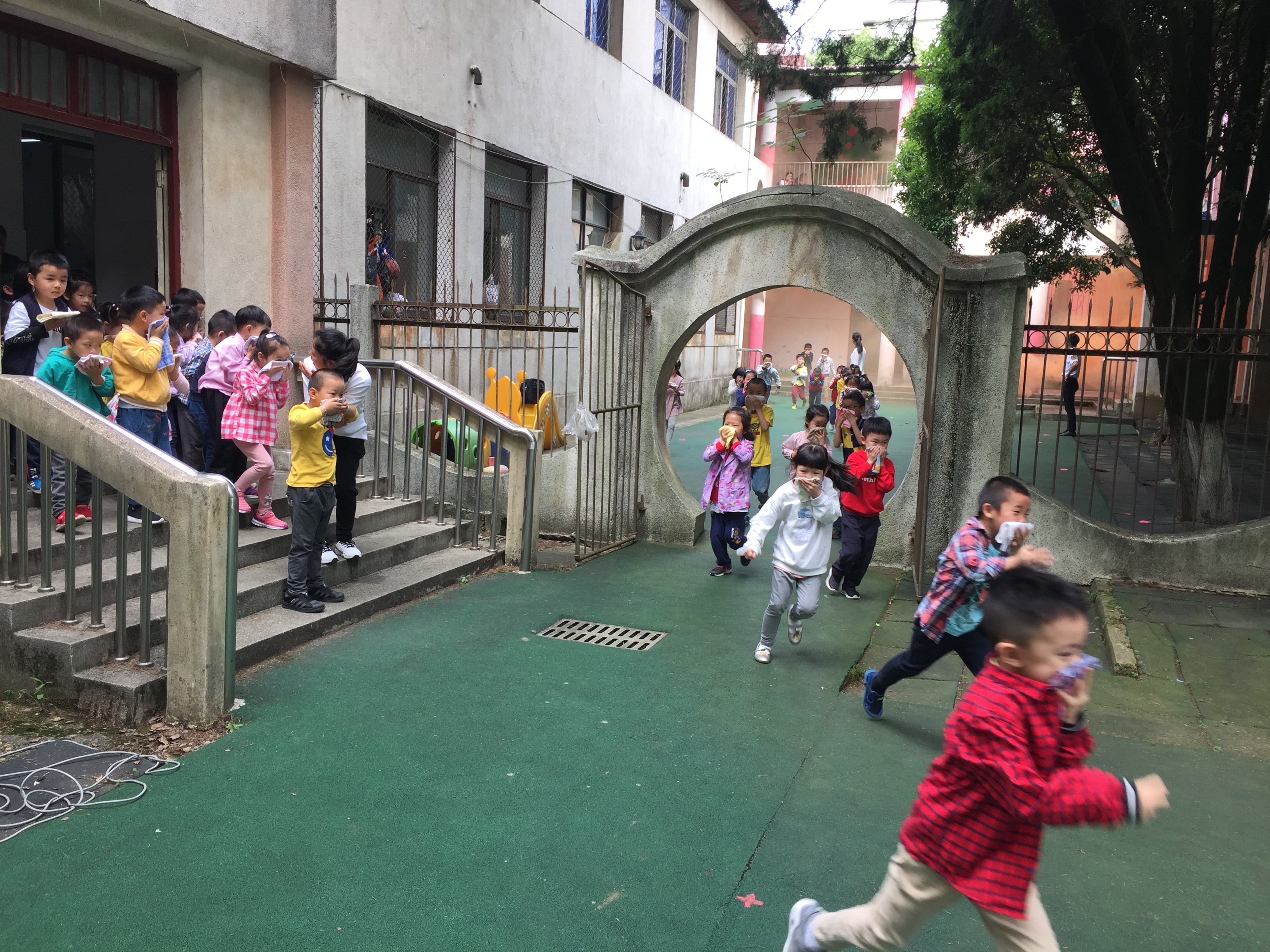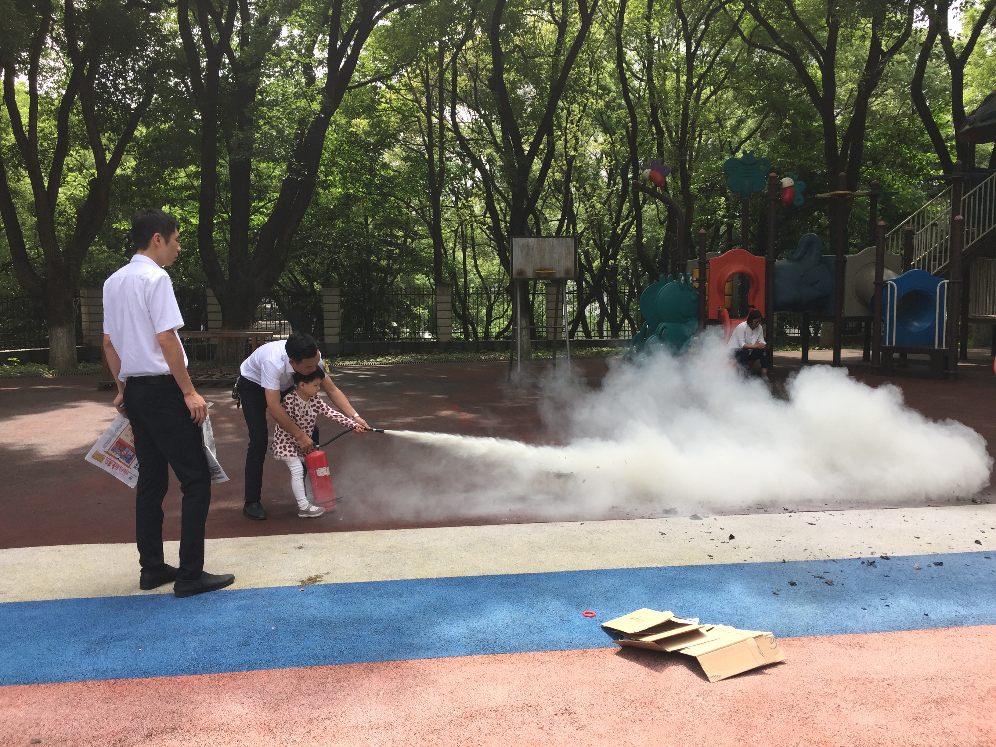 上午9:40左右,园内忽然听到紧急的警报声,各班教师迅速按紧急预案的疏散线路带领幼儿拿起湿毛巾,捂住口鼻,猫着身子,分两道楼梯迅速且有序下楼来到操场。很快孩子们集中到操场安全地带。演习结束后,赣安公益培训中心的万警官为孩子、老师们演示用灭火器灭火的过程,也邀请了孩子、老师们进行体验。
