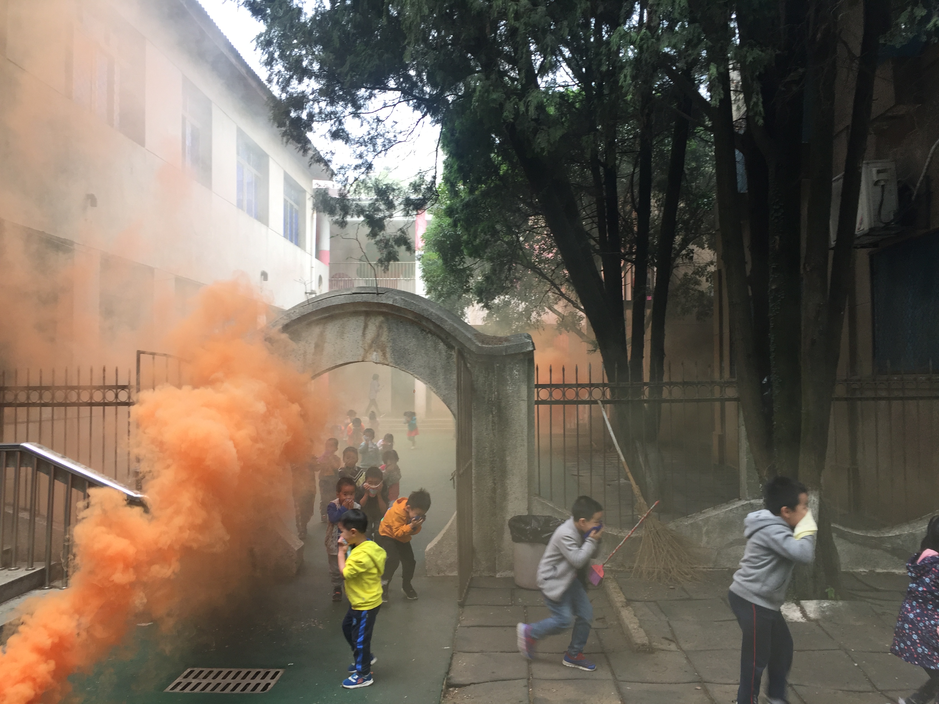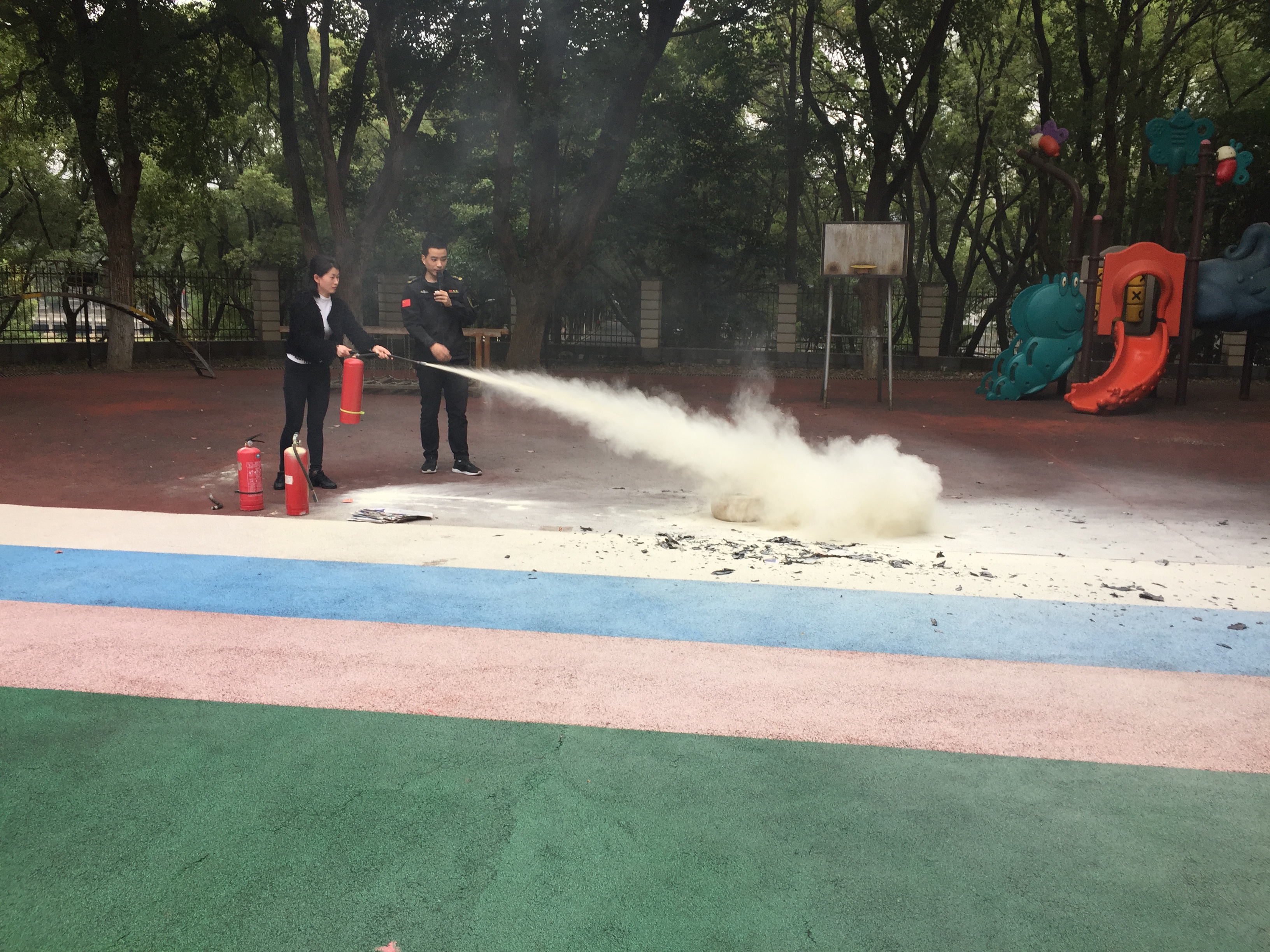响起火灾警报声,演练正式开始了,每位教师迅速按疏散线路带领幼儿拿起毛巾捂住口鼻,弯着身子,有序撤离“火灾”现场。教师们保证幼儿的安全,以免慌乱中出现拥挤或者踩伤幼儿现象。孩子们冷静、快速的到达安全地带。各班迅速地清点班级人数,并向总指挥报告。教官讲解了相关的消防知识、指导幼儿和老师们使用灭火器等等。还特别着重提醒了幼儿园要远离火、电,注意人身安全。