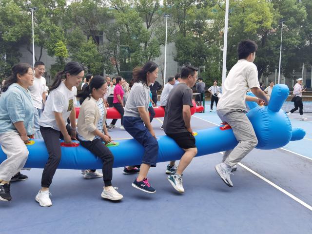 本次趣味运动会精心设计了“齐头并进”“飞镖”“插秧接力”“一钻到底”“旱地龙舟”“不倒森林”等多个集趣味性、协作性于一体的比赛项目。这些项目既考验个人反应能力,也更加强调团队配合,同时也能让教职工在轻松的氛围中体验到运动乐趣。比赛现场热闹非凡,加油声、欢呼声、笑声此起彼伏。在“旱地龙舟”项目中,各队队员骑在充气龙舟的道具上,喊着“一二、一二”的统一口号同步前行,参赛队伍配合默契、稳步前进;“一钻到底”项目更是气氛热烈,参赛队员手牵手,齐心协力用最快的速度钻过比赛道具,场边啦啦队的呐喊助威声震耳欲聋,赛场上,每个人都全身心投入,尽情释放活力,每一个项目的完成都伴随着阵阵掌声与喝彩。